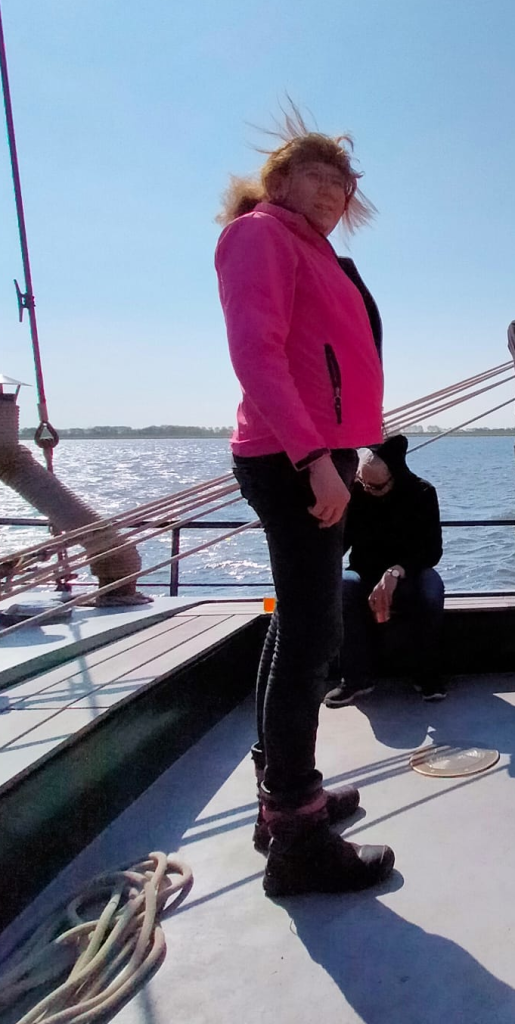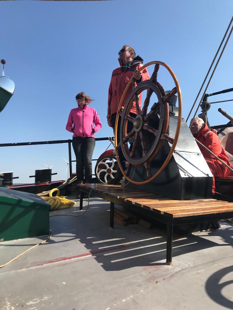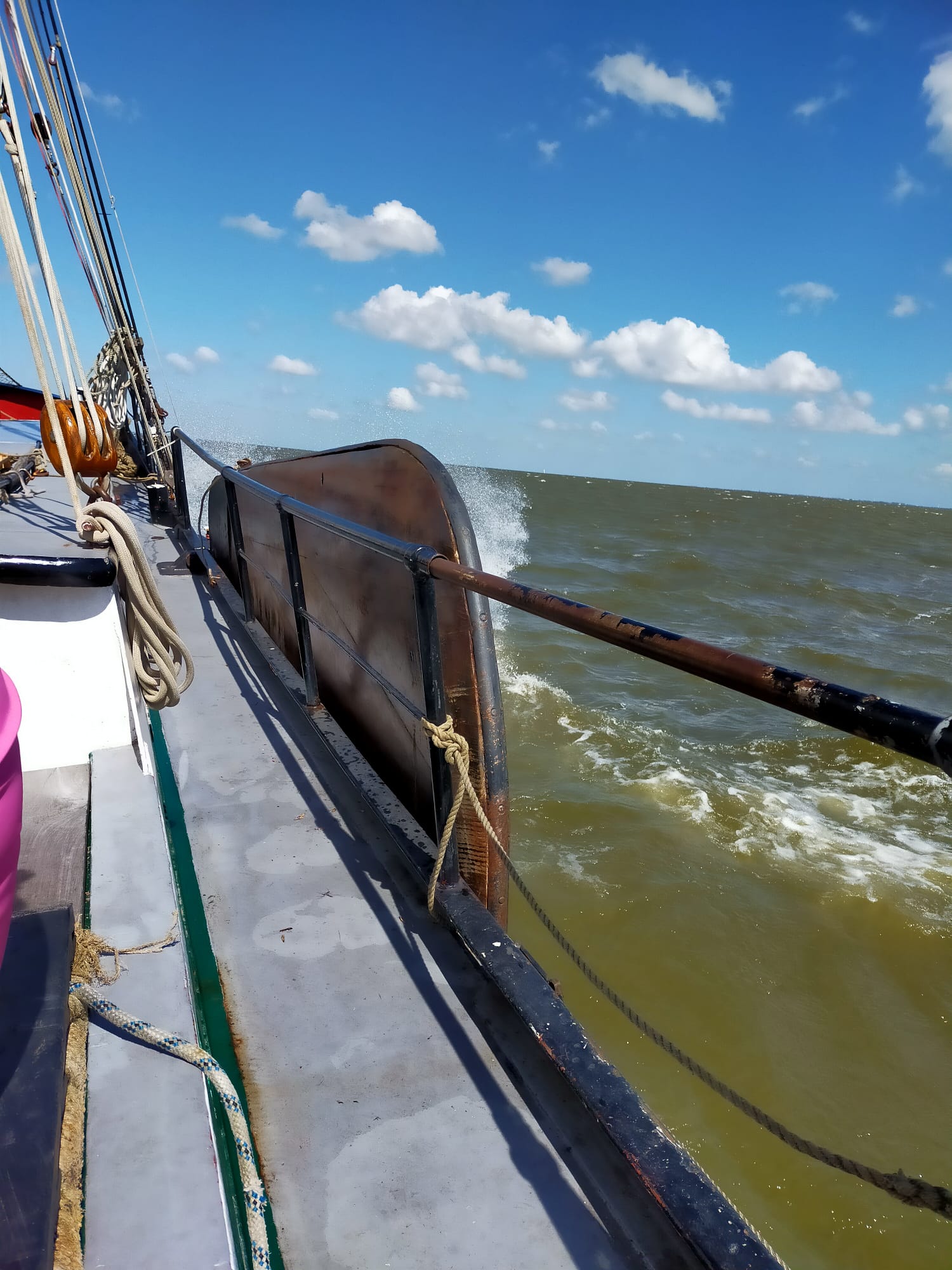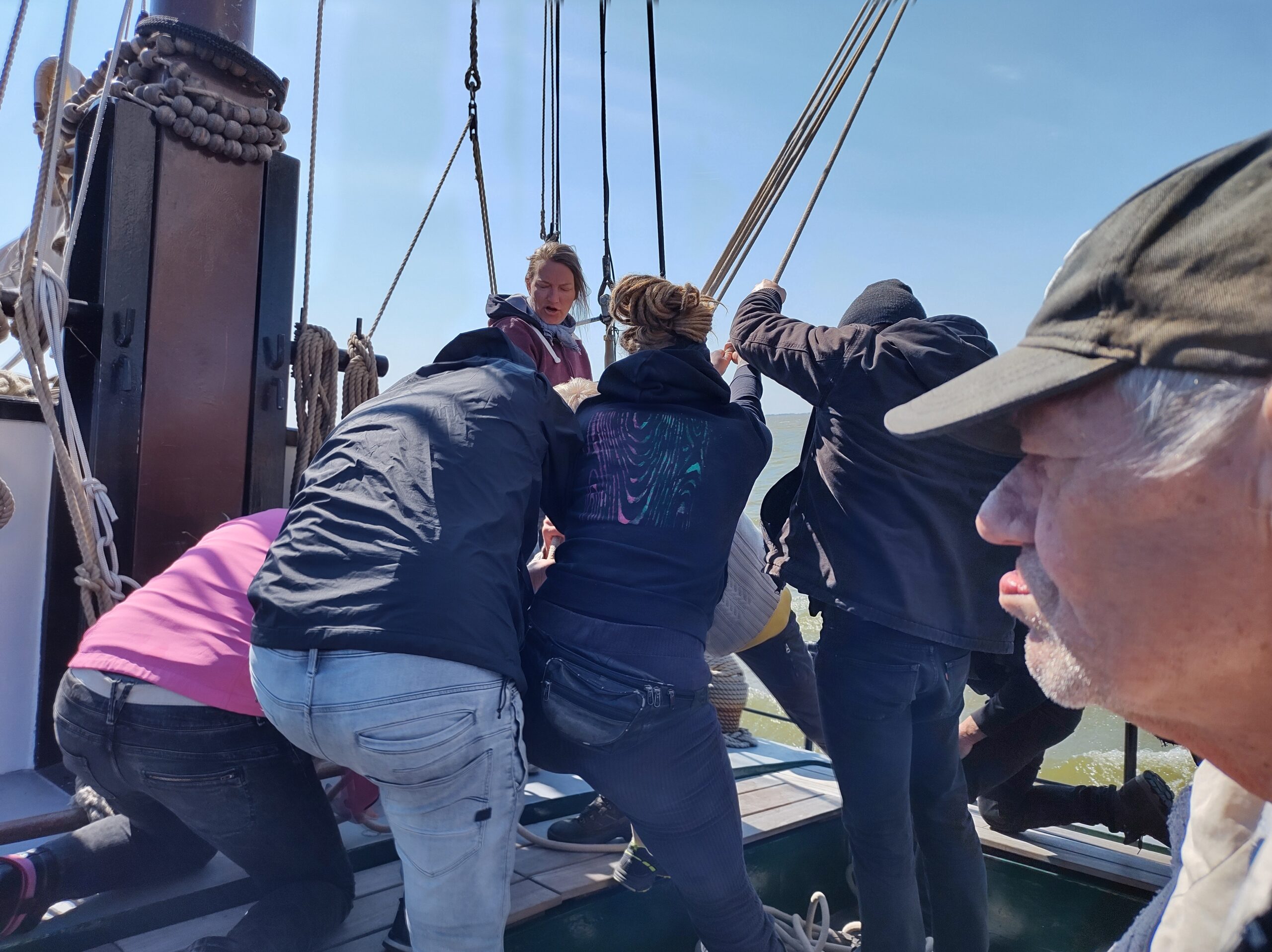 Ondanks de niet bepaald helpende nachtelijke voorbereiding heb ik vervolgens een heerlijk dagje gezeild. Het laatste stuk moesten we nog een flink aantal keer overstag om Lemmer te bereiken. Wat een machtig mooi fenomeen is op zo’n tweemaster met windkracht 5. Alleen die zwaardlieren waren toch een beetje te zwaar geworden voor de oude vrouw die ik nu ben. Ook mijn kapsel besloot met hulp van wind en spatwater een spontane bad-hair-day te krijgen. Ach, het hoort er bij.